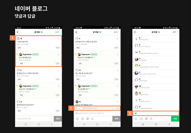 (2) 또 댓글 왼쪽 아래 ‘답글’ 버튼을 누르면 댓글창 위로 ‘누구에게’ 답글을 남기는 건지 확인할 수 있습니다. 좋았던 건, 답글 버튼을 누르면 화면 상단에 해당 댓글을 볼 수 있도록 스크롤을 이동한다는 점이었어요. (3) 네이버 블로그에는 ‘이웃’이라는 개념이 있는데요. 멘션 기능을 활용, 이웃을 지정해 댓글이나 답글을 남길 수 있는 점 또한 눈에 띕니다.