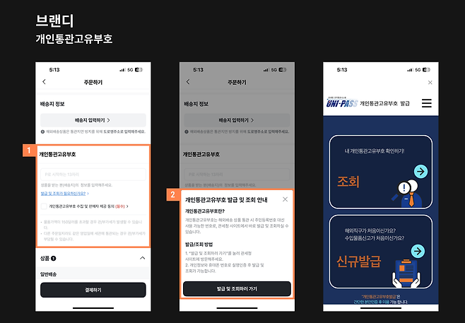 해외에서 배송되는 상품은 (1) 주문/결제 페이지에서 입력하는 플로우로 구성되어 있습니다. 눈에 띄는 점은 발급 및 조회 기능인데요. 바로 조회, 신규 발급 화면으로 넘어가도록 구성한 게 아닌 (2) 개인통관고유부호에 대한 간단한 설명과 발급/조회 방법을 안내하고 있던 점이에요. 이제는 해외 배송 상품들이 많아지면서 개인통관고유부호를 사용하는 경우가 많아졌지만 아직 그렇지 않은 사용자들도 있는데요. 또 브랜디 앱 사용자의 연령대가 낮다 보니 아직 개인통관고유부호가 익숙하지 않은 사용자를 위해 안내 후 발급하는 방식으로 자연스럽게 풀어낸 모습이에요.