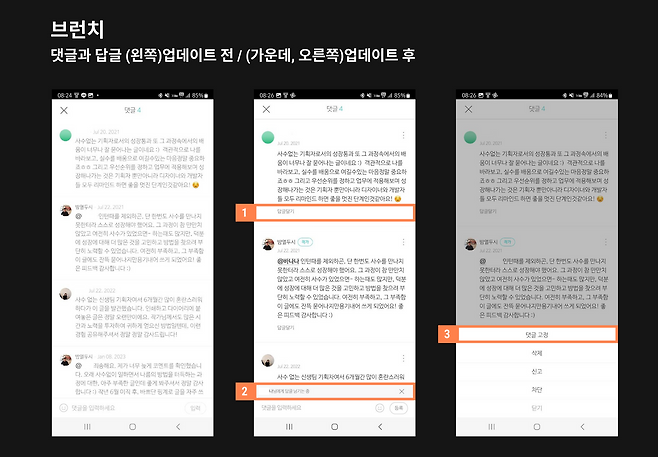 마지막으로 ‘댓글 고정’ 기능도 적용되었는데요. 이건 작가가 사용할 수 있는 기능 중 하나로, 자신의 글에 작성된 댓글 중 다른 사용자(독자)가 함께 봤으면 하는 내용을 상단에 고정할 수 있습니다. 작가와 답글 등으로 글에 대해 이야기한 내용 등을 글과 연관된 콘텐츠의 하나로 활용할 수 있다는 점에서 의미가 있다는 생각이 들어요. 결국 브런치의 이번 업데이트 핵심은 작가와 독자의 소통을 더 원활하게 만들어주는데 초점이 맞춰진 것 같습니다. 곧, 브런치는 작가 ‘응원하기’ 기능을 적용할 계획이기에 그에 앞서 소통을 강화하기 위한 목적이 포함된 것 같네요.