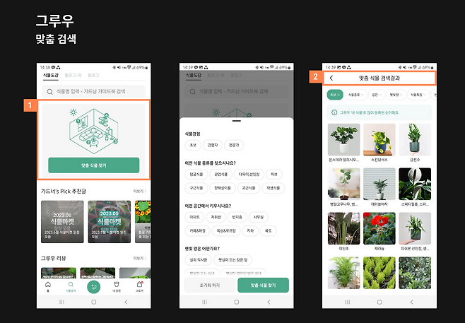 그래서 그루우는 ‘맞춤 식물 찾기’ 기능을 추가했고, (1) 검색 화면에 진입하면 별도의 버튼을 통해 사용할 수 있도록 구성했어요. 버튼을 누르면, 식물경험, 어떤 종류의 식물을 찾는지, 어떤 공간에서 키우는지, 햇빛의 양은 어떤지 등의 질문에 하나씩 답을 하는 방식으로 조건을 채워갈 수 있습니다. 조건을 선택한 뒤 ‘맞춤 식물 찾기’를 선택하면 식물 이름을 기준으로 결과를 하나씩 확인할 수 있어요. 결과 화면에서는 이전에 선택한 조건을 필터 형태로 언제든 다시 선택하거나 변경할 수 있죠. 식물 이름을 몰라도, 나의 조건에 따라 키울 수 있는 식물을 발견할 수 있도록 도와준다는 점에서 기존의 검색 기능을 보완하는 역할을 하고 있다는 생각이 들어요.