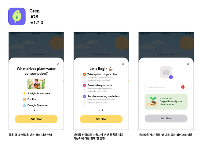 이런 경험을 과학적(?)으로 해결하고자 하는 Greg은 물 주는 방법은 상황에 따라 다르다는 점을 꾸준히 사용자에게 안내하고 있어요. 식물이 위치한 곳에 햇빛이 얼마나 드는지, 화분 사이즈는 어떤지, 건조 상태에서 적응하는 정도는 어떤지 등을 파악해 물을 줘야한다는 내용이 포함되어 있어요. 이렇게까지 고려하지 못한 상태고, 이미 물을 잘 주지 못해 반려식물을 떠나보낸 경험이 있기에 제게는 꽤 매력적인 문제 해결의 시작으로 다가왔습니다.