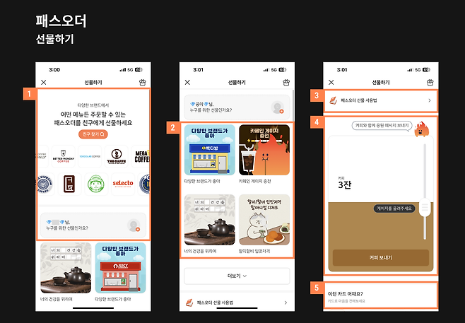(4,5) 이번 선물하기 기능에서 아쉬웠던 점은 선물할 수 있는 상품을 다양하게 보여주기보다상세 화면으로 이동되는 진입점에 초점을 맞추고 있다는 점인데요. (4) 위, 아래로 드래그해 커피 잔 수를 변경할 수 있는 인터랙션을 활용해 여러 금액의 이용권을 선물할 수 있도록 되어 있는데, 화면 내 인터랙션만 봐서는 커피 잔수에 따라 이용권 금액이 다르다는 걸 파악하기 어려웠어요. 또 선물하기 기능과 어떤 관련이 있는지도 짐작하기 어려웠어요.