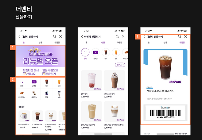 더벤티는 (2) 선물하기 기능이 적용되는 메뉴와 상품을 중앙에 보여주고 있는데요. 사용자의 자유로운 탐색도 중요하지만 선물하기에 진입하는 사용자는 보통 본인이 선물할 상품(메뉴, MD 등)이나 가격대 등을 어느 정도 생각한 상태에서 화면에 진입하기 때문에 항목 별로 카테고리화해서 노출해 주는 게 사용자 입장에선 더욱 편리한 탐색 방법이 될 수 있을 것 같습니다. 또한 베스트 메뉴, 신메뉴 등의 메뉴 추천을 통해 여러 상품을 탐색할 수 있도록 하고 있는데요. (3) 쿠폰함에선 선물한 후에 문자로 전송되는 쿠폰 이미지와 동일한 이미지가 노출됩니다. 이런 경우 별도 터치 없이도 바코드를 큰 화면으로 바로 인식 키실 수 있다는 장점은 있지만 앱 내 자체 UI와는 통일성이 떨어져 보인다는 개선점도 있을 것 같아요.