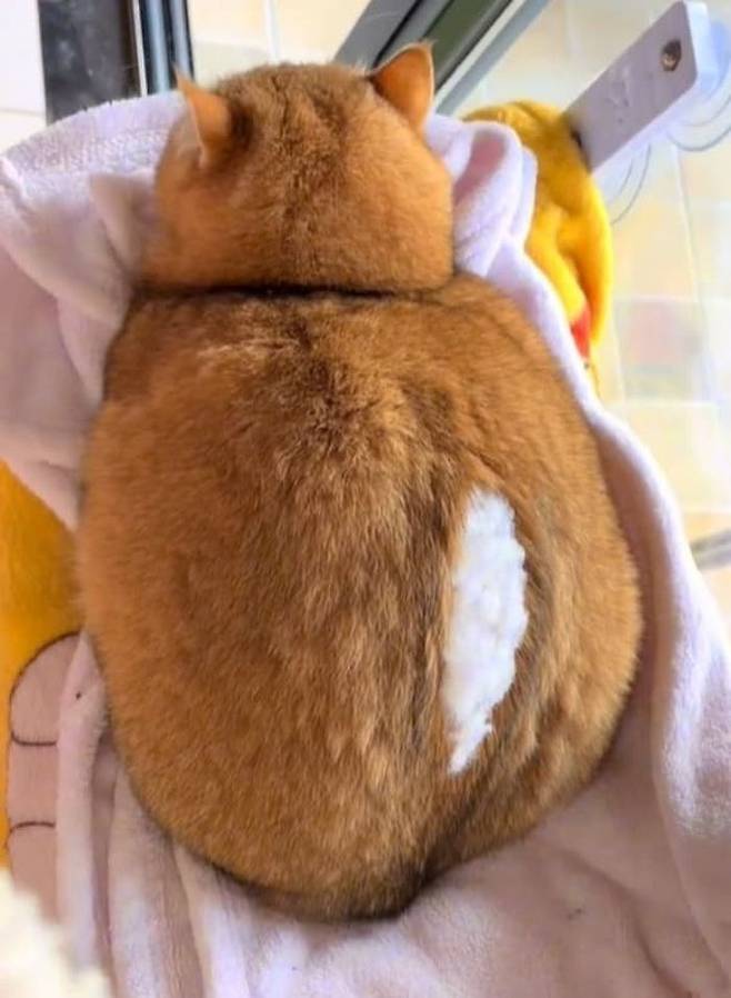 네, 그렇습니다. 정말 살이 쪄도 너무 많이 쪄서 등이 터진 것이 아니라 하필 고양이의 등에 하얀 털들이 구불구불 자라 있어서 하얀 솜털로 오해 받고 있는 상황이라는 것인데요.