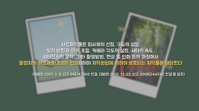 물론 모든 사진에 저작권이 부여되는 것은 아니고, 촬영자의 개성과 창조성이 인정돼야 합니다. 즉, 일반인끼리 찍은 사진들은 누가 찍어도 결과물에 차이가 없을 확률이 높기에 저작권을 인정받기 어렵습니다.