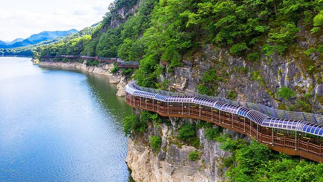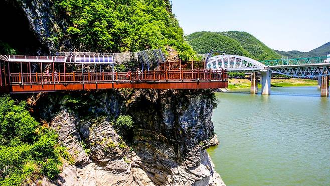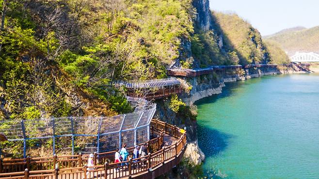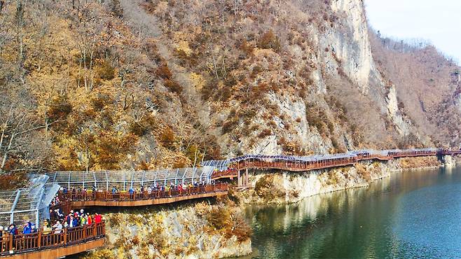 충북 단양군 적성면 수양개유적로를 따라 펼쳐지는 단양강 잔도는 2017년 개통 이후 트레킹 마니아들 사이에서 꾸준히 입소문을 타고 있다.