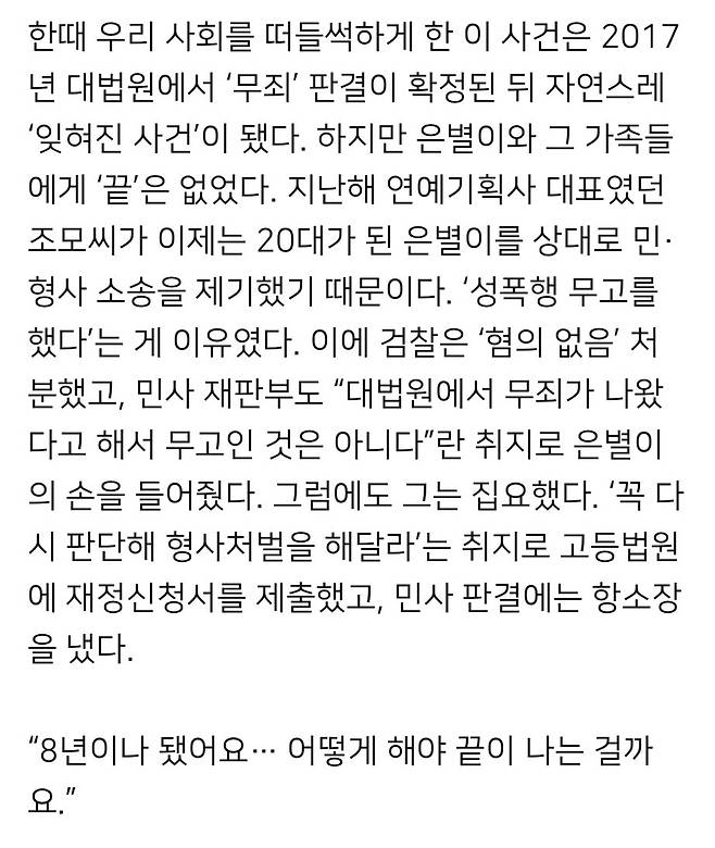 지난해 연예기획사 대표였던 조모씨가 이제는 20대가 된 은별이를 상대로 민·형사 소송을 제기했기 때문이다