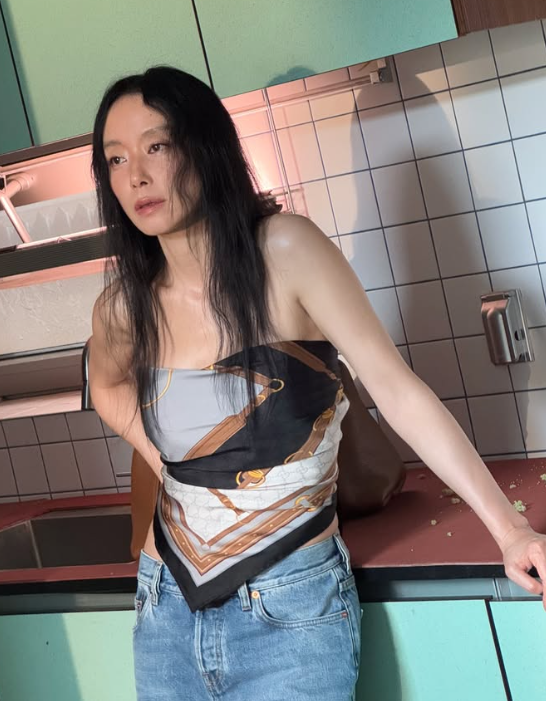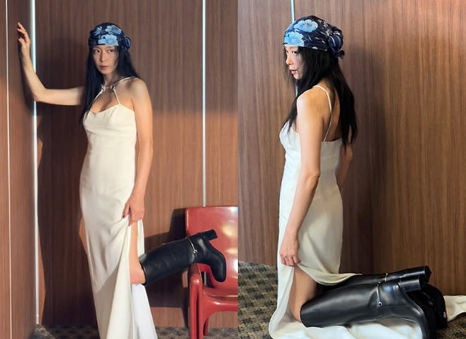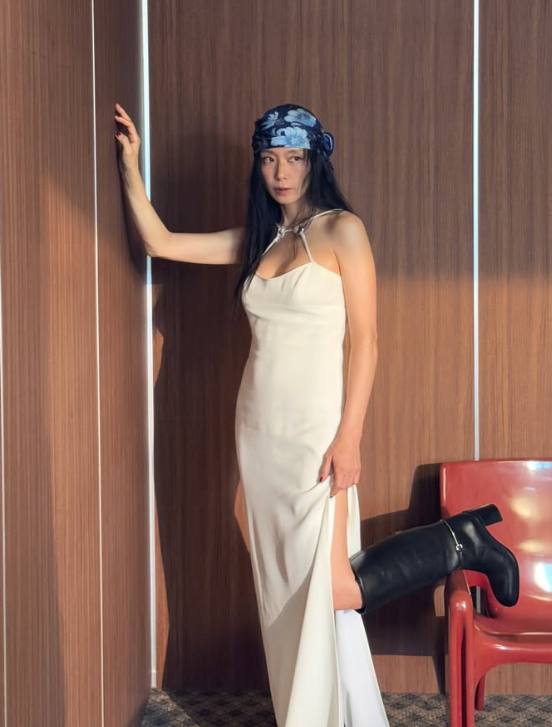 전도연은 화이트 끈나시 원피스를 착용해, 깔끔하면서도 우아한 실루엣을 완성했습니다. 신발은 블랙 롱부츠를 매치하여 룩에 강렬하고 세련된 마무리를 주었죠. 블루 컬러의 스카프는 룩에 색다른 포인트를 주며, 독특하고 감각적인 매력을 더했습니다.