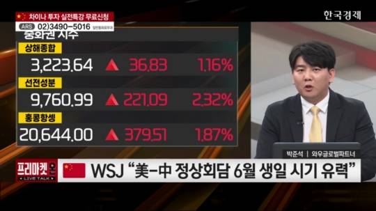 지난 10일(목), 한국경제TV ‘프리마켓온’에 출연한 박준석 와우글로벌 파트너는 "미국의 관세 인상조치에도 불구하고 중국 주요 증시 지수가 일제히 상승 마감했다"고 전했다. 중국 정부의 강력한 증시 부양 의지, EU의 미국을 향한 보복관세 조치 움직임도 호재로 작용한것으로 분석했다.
