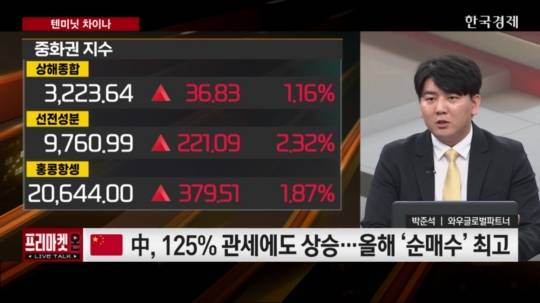 지난 10일(목), 한국경제TV ‘프리마켓온’에 출연한 박준석 와우글로벌 파트너는 "미국의 관세 인상조치에도 불구하고 중국 주요 증시 지수가 일제히 상승 마감했다"고 전했다. 중국 정부의 강력한 증시 부양 의지, EU의 미국을 향한 보복관세 조치 움직임도 호재로 작용한것으로 분석했다.