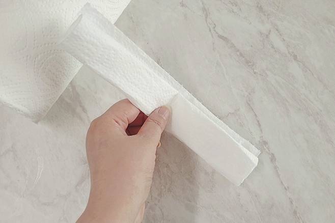 키친타월을 적당히 뜯어 위 사진처럼 접어줍니다.