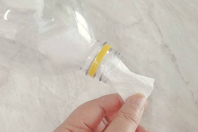 쌀을 넣으려고 페트병을 찾아보니 물을 다 마신 생수병이 있더라고요. 하지만 페트병 속에 물기가 남아있어 바로 담을 수 없겠더라고요. 보통은 페트병이 다 마르기까지 기다려야 하지만 바로 쌀을 담고 싶다면 이렇게 해보세요.