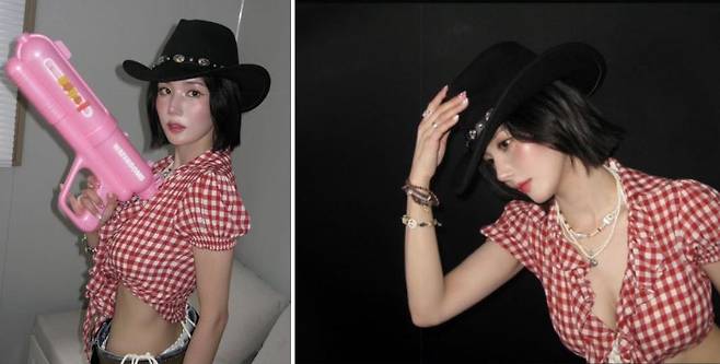 권은비는 레드 체크 크롭 블라우스& 청 반바지