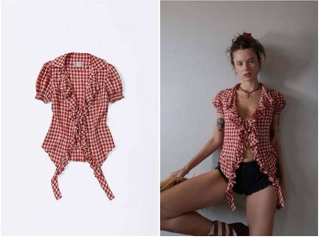 권은비가 입은 레드 체크 크롭 블라우스가
