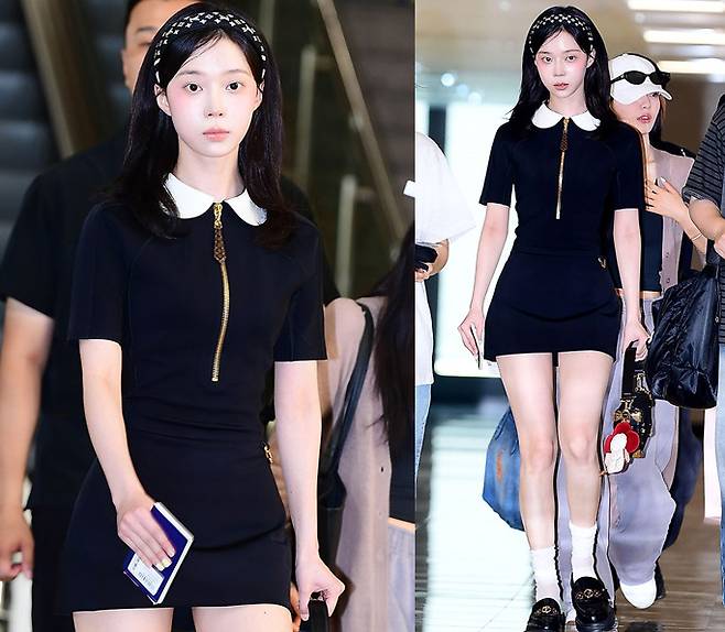 윈터는 화이트 카라와 골드 지퍼 장식이 포인트인 블랙 미니 원피스를 착용해 단정하면서도 세련된 무드를 연출했습니다.