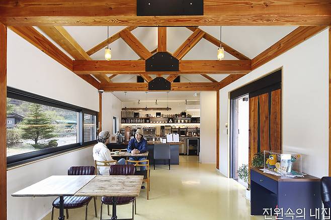 주택은 중목구조와 경량목구조를 혼합한 구조로 지어졌다. 그래서 카페 공간은 중목구조 특유의 트러스 구조체를 노출해 인테리어 요소로 삼았다. 카페는 모조리 새로운 것으로 바꾸기보다는 북촌 시절의 가구와 설비 등을 많이 가져왔는데, 이를 위해 사소한 물건들 하나하나 치수를 도면에 반영했다. 덕분에 카페는 자연스럽게 시간이 녹아든 느낌이다.