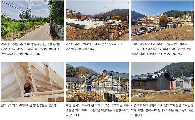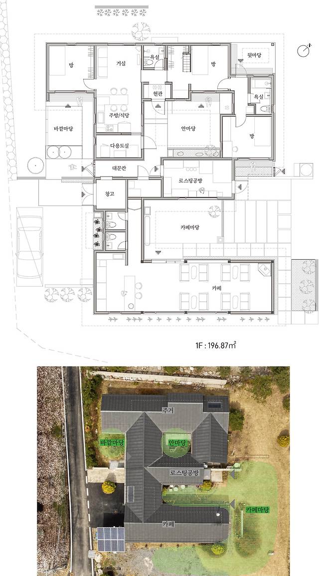 건축면적·연면적 : 196.87 ㎡(59.55평)(주거 – 115.1㎡, 카페 – 65.5㎡, 로스팅 공방 – 16.2㎡)