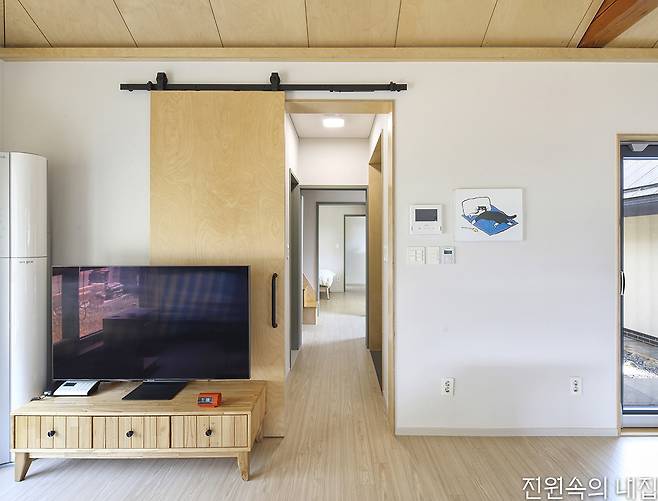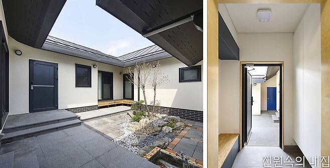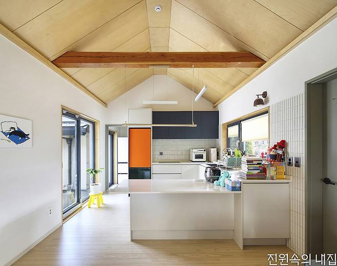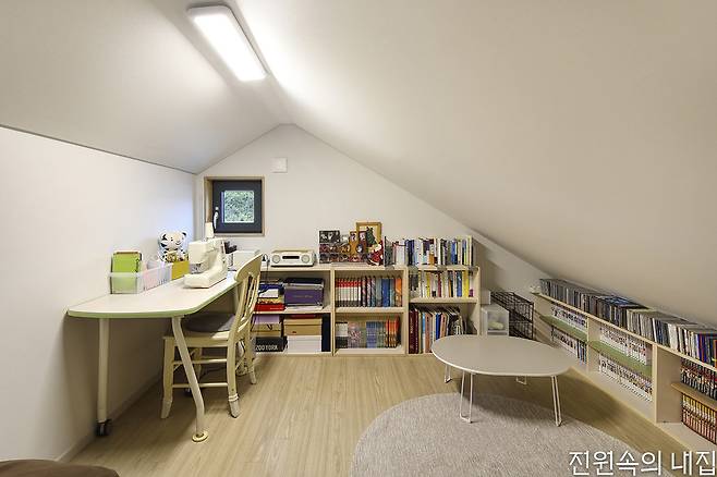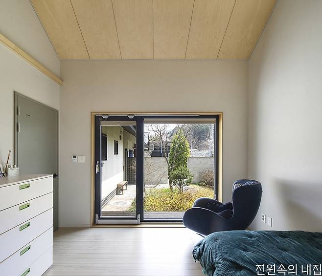 카페 출입구 반대편, 독특한 형태의 주택 대문을 열고 들어가면 외부의 시선에서 자유로운 아늑한 안마당이 나온다. 현관을 지나면 왼편으로는 거실과 주방, 침실이, 오른편으로는 욕실과 다른 침실, 그리고 아내의 아지트 역할을 하는 다락이 자리한다. 일로든 휴식으로든 카페에서 많은 시간을 보내기에 거실과 주방은 비교적 콤팩트한 규모를 가졌다. 하지만 높은 천장과 안마당의 존재 덕분에 집은 갑갑하지 않다.