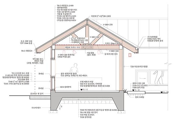구조 : 기초 – 철근 콘크리트 매트구조 / 지상 – 일반 목구조 + 중목 혼용
