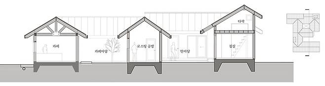 주택은 한 채지만, 크게 카페와 공방, 살림집, 세 부분으로 나뉜다. 그리고 세 부분은 수직의 층 구분보다 외부와의 접촉면을 늘리기 위해 수평하게 펼쳐졌다. 주택은 직주근접하면서 업무와 일상의 분리를 위해 공간과 마당의 배치, 동선까지 여러 고민을 거쳤다. 카페마당과 바깥마당, 안마당으로 나뉘는 세 마당은 각 공간에서 다양한 풍경을 누리면서 공간과 시야를 확장하는 역할을 한다.
