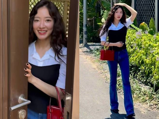 부츠컷 데님 팬츠를 매치해 청순하고 멋스러운 포인트를 주었습니다.