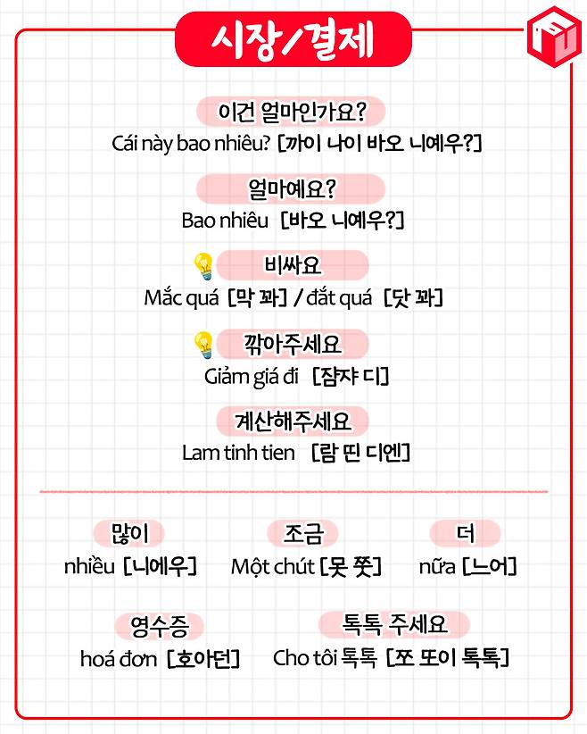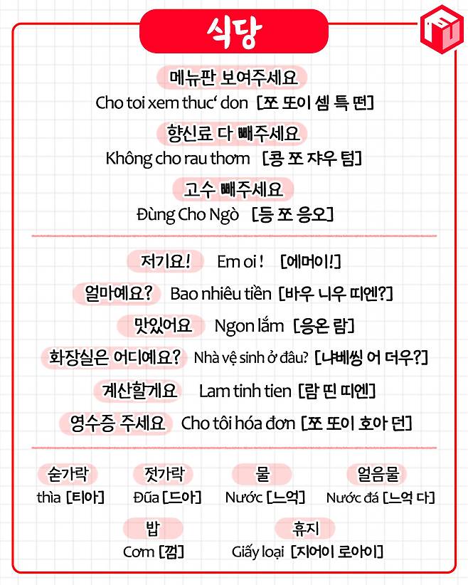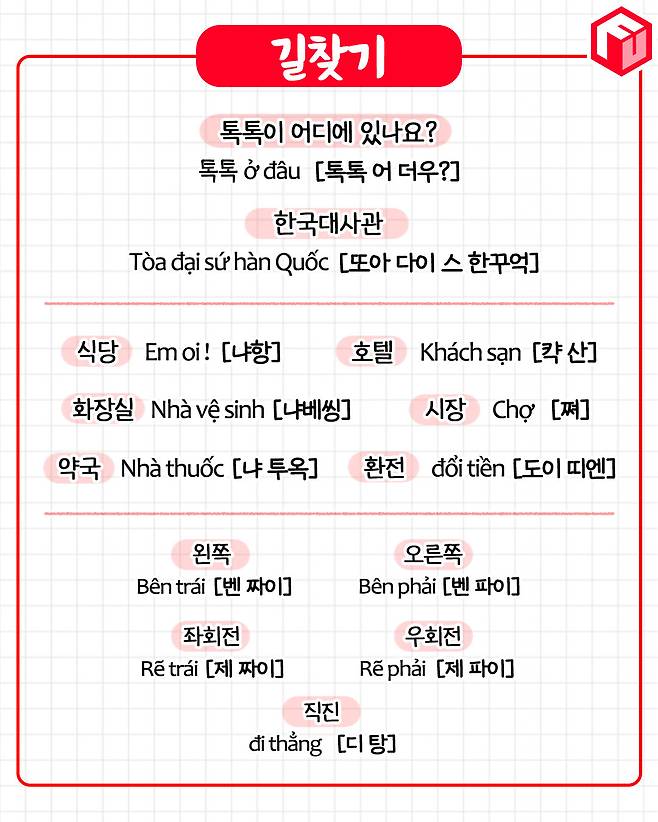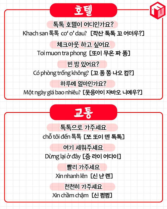 오늘 여행톡톡은 상황별 베트남 여행 회화를 총정리해 공유합니다. 보기 좋게 상황별 베트남 여행 회화를 한 장에 모두 담았으니 필요한 부분은 이미지를 저장해 현지에서 꺼내 보세요!