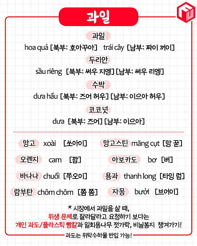 베트남에서는 당도 높고 신선한 과일을 저렴한 가격에 마음껏 즐길 수 있습니다. 시장이나 마트 등에서 원하는 과일을 찾을 때 유용한 과일 표현입니다. 베트남어로도 함께 표시해뒀으니 가게의 간판 등에서 보다 편리하게 원하는 과일을 찾을 수 있으시길 바랍니다.