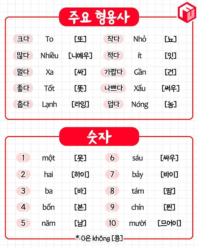 베트남 여행 회화로 필요할 수도 있는 주요 형용사와 숫자 표현입니다. 숫자 표현은 재미삼아 보셔도 좋을텐데요. 한국인들의 '건배', '짠' 처럼 베트남 현지에서도 술잔을 부딪히며 하는 표현이 있습니다.
