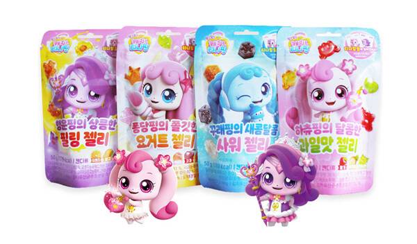 글로벌 인기 애니메이션 ‘캐치! 티니핑’의 IP를 활용한 캐릭터 젤리 4종도 시중에서 만날 수 있다. 작중의 주요 캐릭터를 활용한 제품 4종으로, ‘행운핑의 상큼한 필링 젤리’, ‘퐁당핑의 쫄깃한 요거트 젤리’, ‘꾸래핑의 새콤달콤 사워 젤리’, ‘하츄핑의 달콤한 과일맛 젤리’의 4종이다. 작품 속에 등장하는 티니핑 씰이 랜덤하게 하나씩 패키지에 들어가 있다. 4종류 모두 편의점 기준 판매가는 1,800원이다.