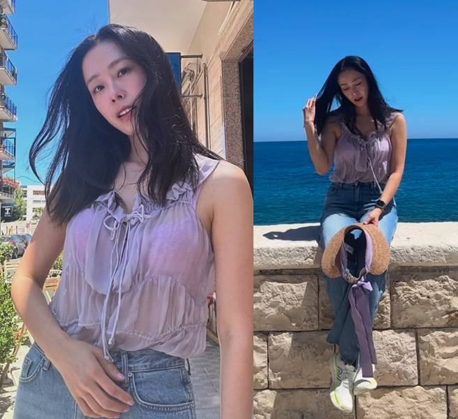 홍수현은 부드러운 라벤더 색상의 실키한 시스루 블라우스를 착용해 고혹적이고 우아한 패션을 자랑했습니다.