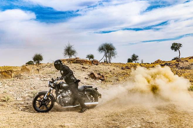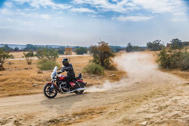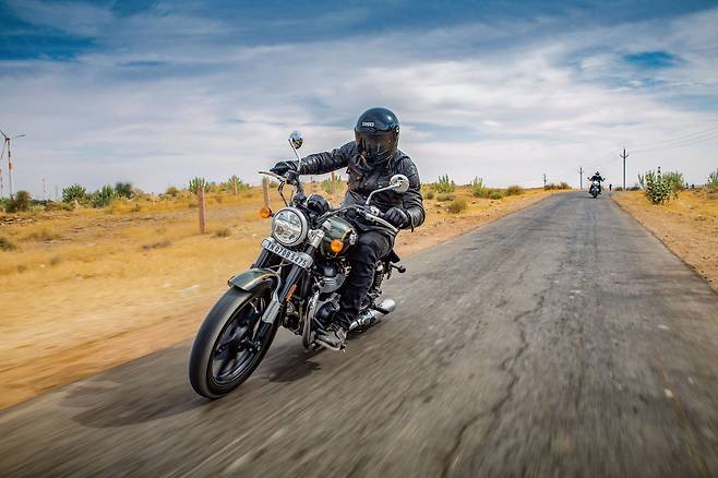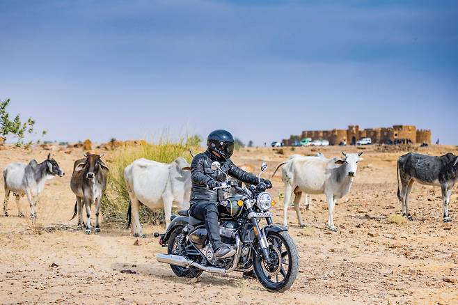 이번 테스트에 참여하며 로얄엔필드가 슈퍼메테오에 거는 기대의 크기를 느낄 수 있었다. 지금까지 참여했던 모든 미디어 테스트를 통틀어 가장 큰 규모에 가장 많은 준비를 했음을 느낄 수 있었다. 테스트는 인도 서부의 사막지대인 라자스탄 지역에서 이틀에 걸쳐 진행이 되었는데, 첫날은 자이살메르 주변 도로를 달리며 촬영과 성능테스트를 진행했고 둘째 날에는 자이살메르를 떠나 킴사르까지 350km가 넘는 장거리 라이딩을 통해 크루저의 장거리 주행 실력을 테스트해볼 수 있었다. 특히 거점 이동했기 때문에 실제 장거리 투어를 온 것 같은 느낌을 받았다. 350km 연속주행 후에도 엉덩이가 조금 얼얼하긴 하지만 피로감이 그리 크지 않았을 만큼 편안한 투어가 되었다.