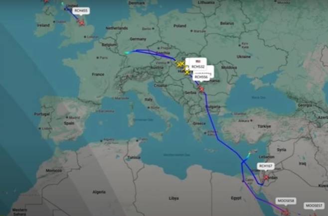 6월 20일 오전에는 최소 10대 이상의 C-17 대형 수송기들이 독일 람슈타인 공군기지에서 이륙해 이스라엘의 네바팀 공군기지, 요르단의 무아파크 살티 공군기지, 사우디아라비아의 프린스 술탄 공군기지로 탄약을 실어 나른 것이 확인되었습니다.