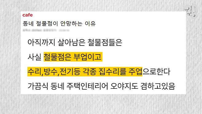 “동네에 많은 철물점이 살아남기 위해서 집에 가서 전구도 갈아주고 수도꼭지도 갈아주고 이런 것들도 많이 서비스한다고 하거든요. 한번 출장 가서 수도꼭지 갈고 전구 갈고 하면 단돈 5천 원, 만 원, 2만 원 받을 거 아니에요. 큰돈이 아니더라도 문 닫을 정도까지 수익이 없지는 않은...”