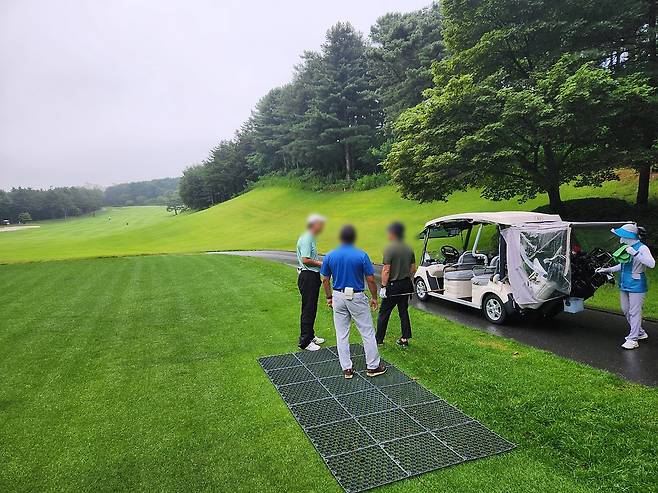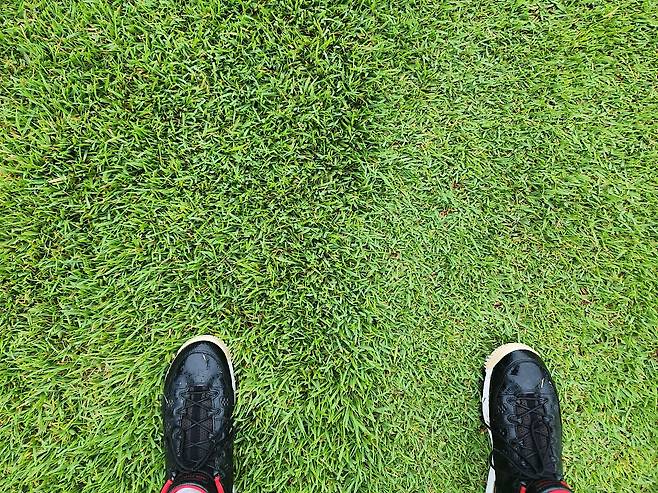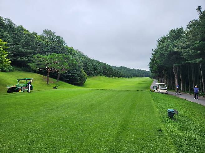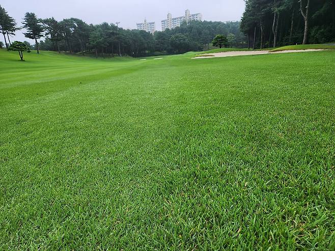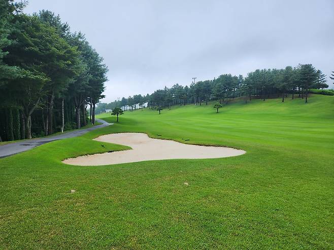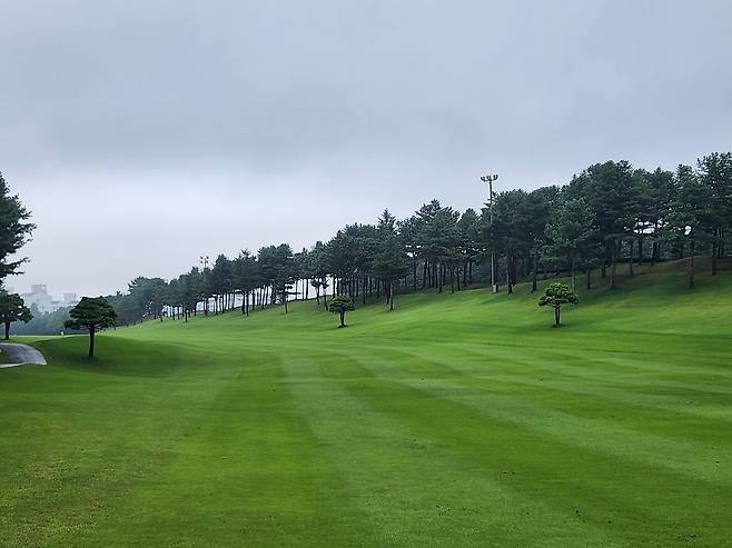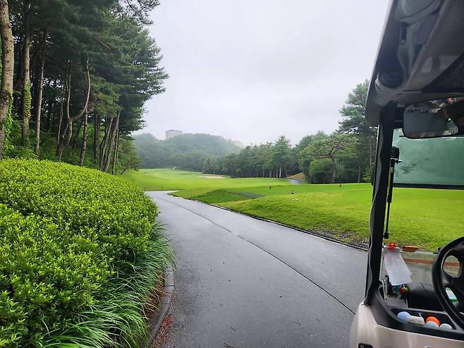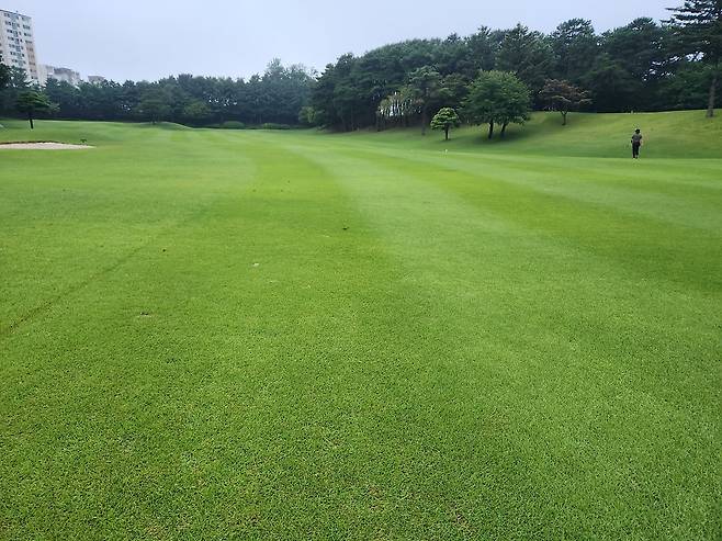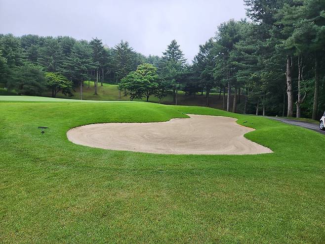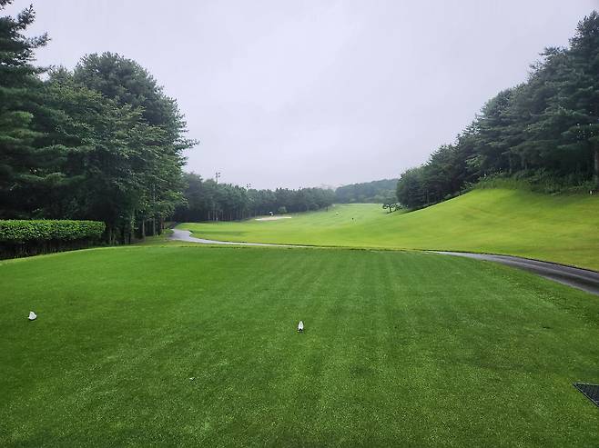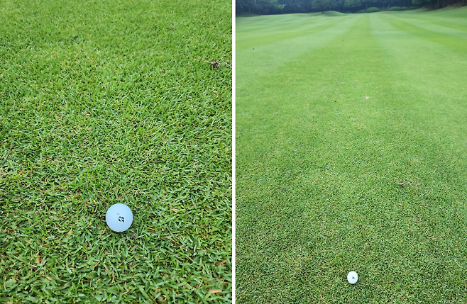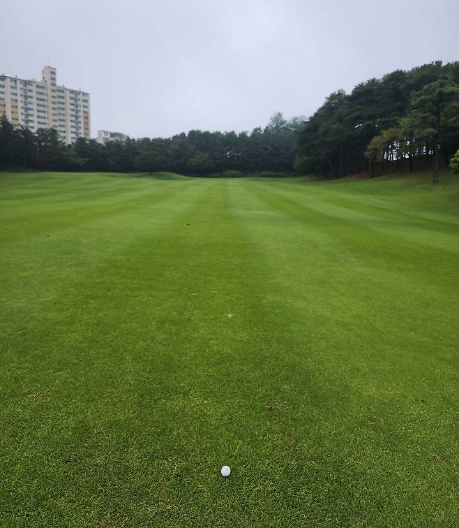 중지 페어웨이 및 러프에 공이 잔디 위에 잘 올라서있습니다. 페어웨이 몇 군데에 서면 발밑에 물이 약간 올라오는 게 보였지만 제체로 물이 잘 빠지는 골프장입니다. 우측이나 좌측 카트길 넘으면 OB 지역이지만 페어웨이가 상당히 넓은 편이어서 크게 위험하진 않습니다. 러프 길이도 짧게 관리되어 있어서 어렵지 않았고 관리는 상당히 잘돼있는 골프장입니다.