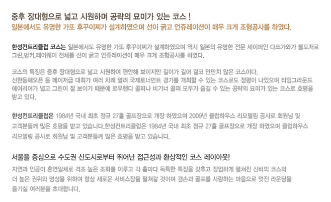 수도권에서 접근이 매우 수월한 명문 한성 CC는 여전히 관리 및 서비스가 뛰어났습니다. 총 27홀로 구성된 회원제 코스는 넓은 페어웨이와 곧게 뻗은 홀들로 초/중 실력의 골퍼에게도 편안한 플레이를 선사합니다. 다만, 가까울수록 그린피는 비싸네요.