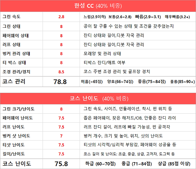 이날 플레이한 한성 CC 난이도는 중간이라고 할 수 있습니다. 페어웨이는 꽤 넓고 평평한 편이어서 그리 어려운 레이아웃은 아니었으나 그린이 단단한 편이고 핀 높이로 겨냥할 시 옆 라이 퍼팅이 자주 걸렸습니다. 작지만 솥뚜껑 모양의 그린 때문에 숏게임으로도 내리막 또는 옆 라이에 걸리지 않도록 신경을 써야 합니다. 파3 홀은 화이트 티에서 약 140-150m였습니다. 파 5 홀들은 대체로 긴 편이어서, 평균 드라이버 거리 220m 나가는 저에게는 투 온 보다는 안전하게 쓰리원을 노리는 게 유리했네요. 그외, 평온함 속에서 아기자기한 즐거움을 주는 골프장으로 가까운곳을 찾을 시 강추합니다.
