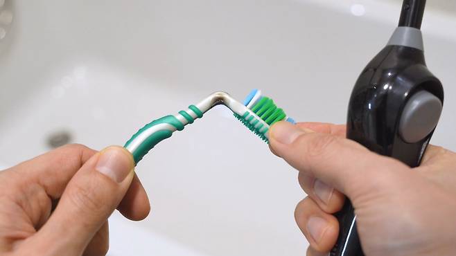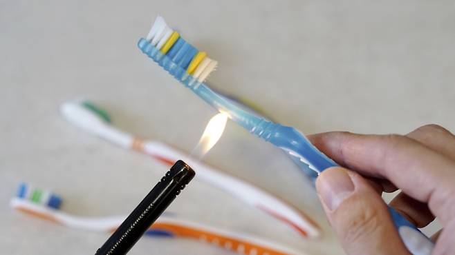 이럴땐 칫솔 목 부분을 라이터로 짧게 지져 주세요. 그러면 플라스틱이 말랑말랑해져 구부리기 쉬운데요. 목을 안쪽으로 구부린 후 잠시 유지하세요. 플라스틱이 굳으면 손을 떼어 주세요.