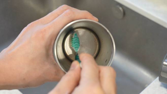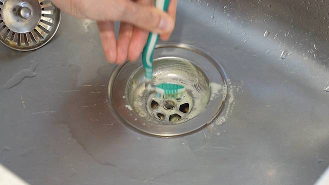 같은 칫솔을 한번 더 활용해 볼 건데요. 주방 배수구는 조금 더 안쪽으로 들어가 있기 때문에 닦기가 쉽지 않아요. 이 칫솔에 세제를 뭍힌 후 닦으면 칫솔이 구부려져 구석구석 청소하기 좋습니다.