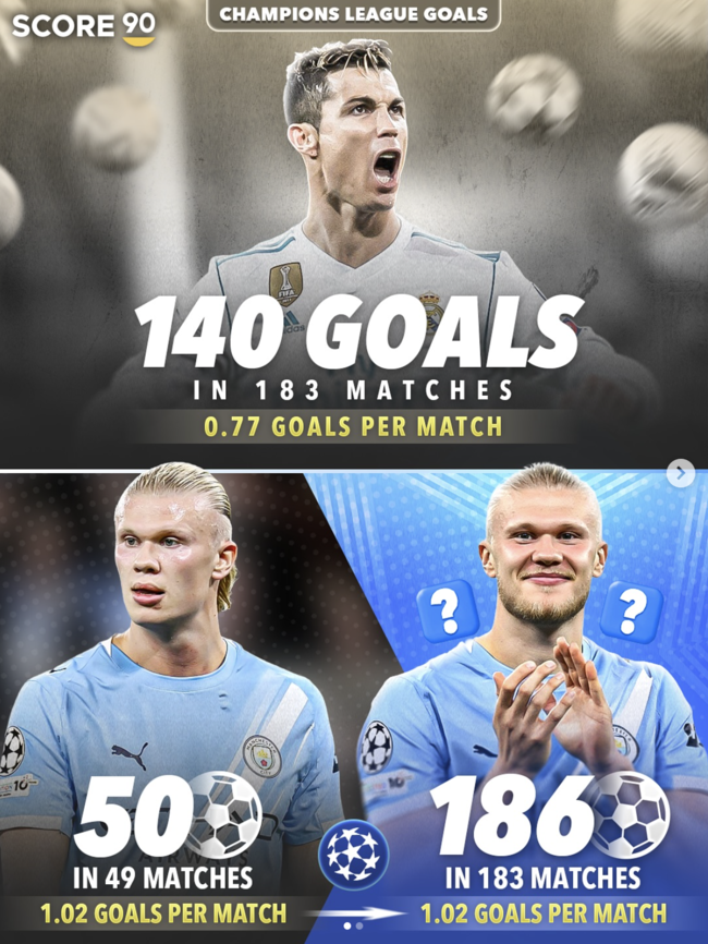 해당 게시물에 제시된 기록에 따르면 홀란드는 지금까지 UCL 49경기에서 50골을 넣고 있다. 한편 호날두는 UCL 183경기에서 140골을 득점했다. 홀란드가 현재의 득점 페이스를 유지하면서 호날두가 출장 경기 수인 183경기를 채운다면 무려 186골을 기록하게 된다. 호날두보다 46골이나 더 득점하게 되는 것이다.