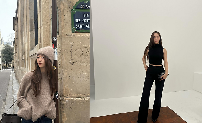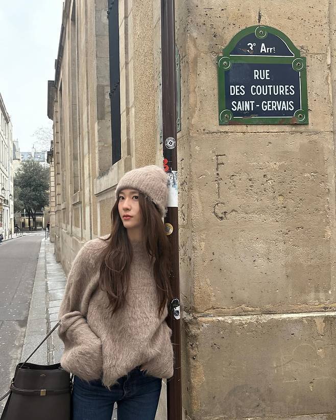 두번째 사진에서는 파리 거리에서 연출한 부드러운 니트 스타일이 돋보인다. 포근한 질감의 브라운 니트 스웨터와 데님 팬츠를 매치해 클래식하면서도 편안한 분위기를 자아냈다. 니트와 같은 톤의 모자를 더해 통일감을 주었으며, 블랙 가방으로 실용성과 스타일을 동시에 잡았다. 배경과 어우러진 자연스러운 패션이 눈길을 끈다.