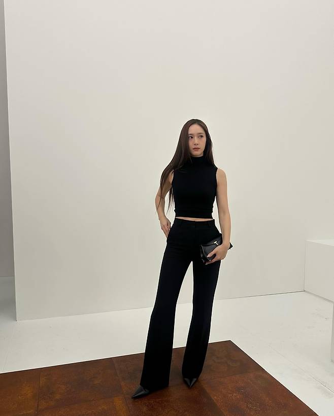 세 번째 사진에서 정수정은 세련된 블랙 모노톤 스타일을 연출했다. 몸에 딱 맞는 크롭 터틀넥과 와이드 슬랙스를 매치해 간결하면서도 우아한 실루엣을 완성했다. 여기에 블랙 클러치와 날렵한 앞코가 돋보이는 힐을 더해 도시적이고 시크한 분위기를 강조했다. 전체적으로 미니멀하면서도 고급스러운 패션이 돋보인다.