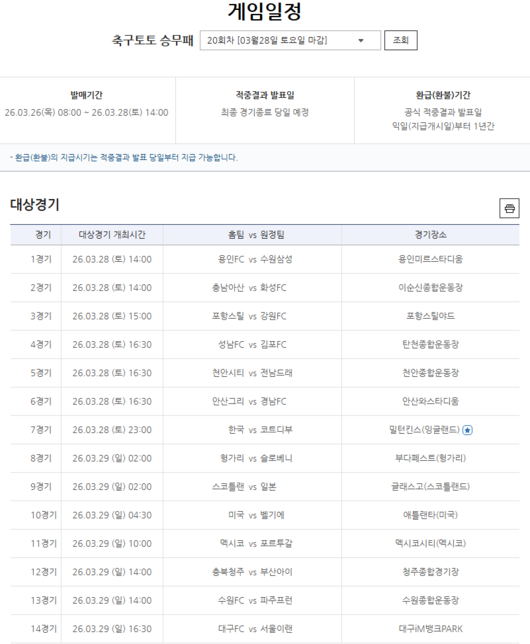 한편, 축구토토 승무패 20회차는 3월 26일(목) 오전 8시부터 발매를 개시해 3월 28일(토) 오후 2시까지 구매할 수 있다.