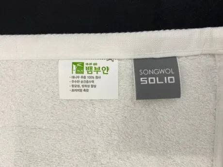 송월타올 뱀부얀 솔리드 수건은 이름에서도 나와 있듯이 대나무인 뱀부 소재를 사용한 수건입니다. 수건에 붙어 있는 택에서도 뱀부 소재인 것을 단 번에 알 수 있습니다. 뱀부 소재는 비싸지만 면 소재 대비 해서는 촉감으로 느껴질 정도로 더 부드러운데, 실제로 송월타올 솔리드 뱀부 수건을 만져보았을 때 매우 부드러운 편이었습니다. (촉감에 대한 이야기는 뒤에서 자세히 설명드리겠습니다.)