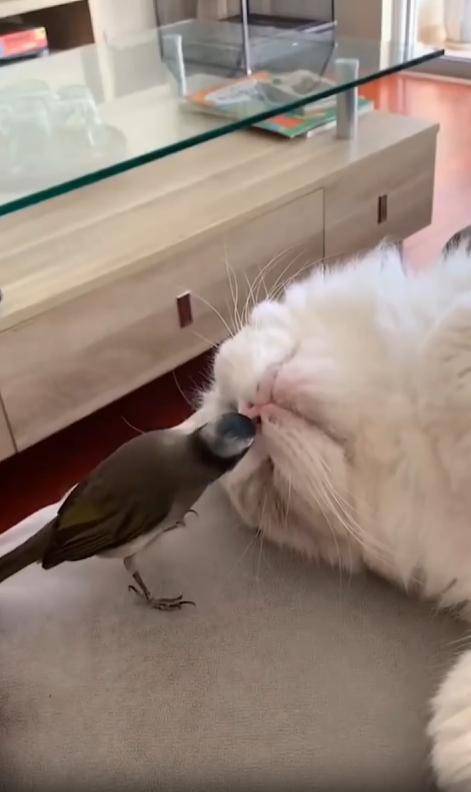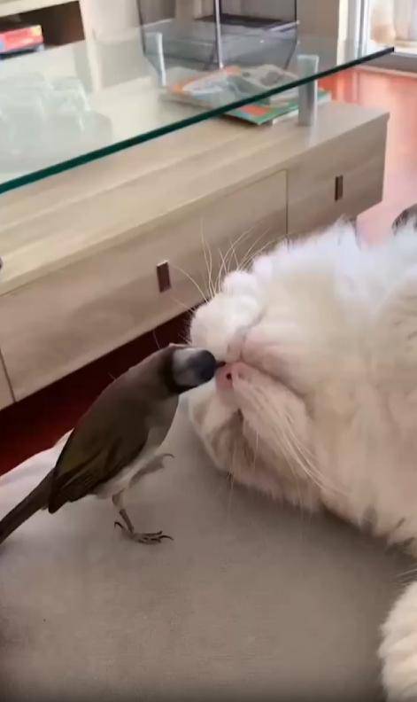 이 조합 실화인가요? 고양이의 얼굴을 정성껏 다듬는 새 한 마리