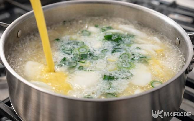 6. 국물이 끓는 상태에서 풀어둔 계란을 가장자리부터 천천히 붓는다. 잠시 둔 뒤 한 번만 젓는다.