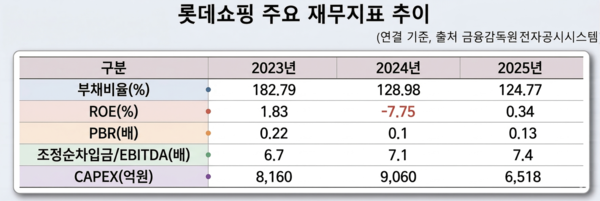 자본적 지출(CAPEX)의 역주행 가능성도 리스크 요인이다. 롯데쇼핑의 CAPEX는 2022년 5500억 원에서 2023년 8100억 원, 2024년 9060억 원으로 매년 급증해 왔다. 지난해에는 다시 6000억 원대로 규모를 줄이며 숨 고르기에 나섰으나, 상암 DMC 롯데몰과 같은 대형 복합 개발 사업이 본격화될 경우 CAPEX 수치는 다시 반등할 것으로 보인다.
