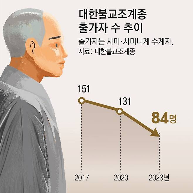 하지만 뾰족한 해법을 찾기 어렵다는 말들이 나온다. 1999년 532명을 정점으로 2010년 287명, 2020년 131명, 2022년 61명으로 출가자가 급감한 조계종은 은퇴자 출가 연령을 50세 미만에서 65세로 확대하는 ‘은퇴출가자제도’, ‘청소년 출가·단기 출가 제도’ 등 지원책 도입으로 지난해 출가자가 다소(84명) 늘었지만, 추세를 막기에는 역부족이라는 게 내부 기류다.