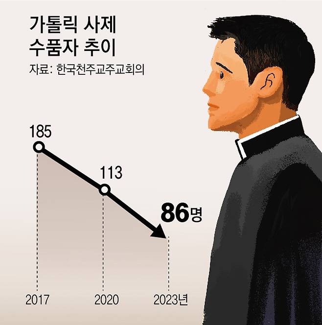 사제를 양성하는 부산가톨릭대 신학대학은 신입생 부족 등의 이유로 2019학년도부터 폐지됐다. 신학생 중 부산교구 출신은 대구가톨릭대로, 마산 교구 출신은 광주가톨릭대로 보내졌다. ‘한국 천주교회 통계 2023’에 따르면 전국 가톨릭대 신학대 입학생은 2013년 143명, 2018년 130명에서 지난해 81명으로 줄었다. 가톨릭대는 대체로 정원이 40명 안팎이지만 일부는 신입생 모집이 어려워지자 20명 안팎으로 정원을 줄였다. 하지만 대부분 매년 10∼15명만 입학하는 실정이다.