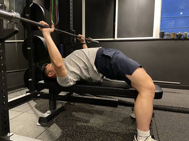 벤치에 누운 상태에서 바벨을 어깨너비보다 조금 넓게 잡는다.