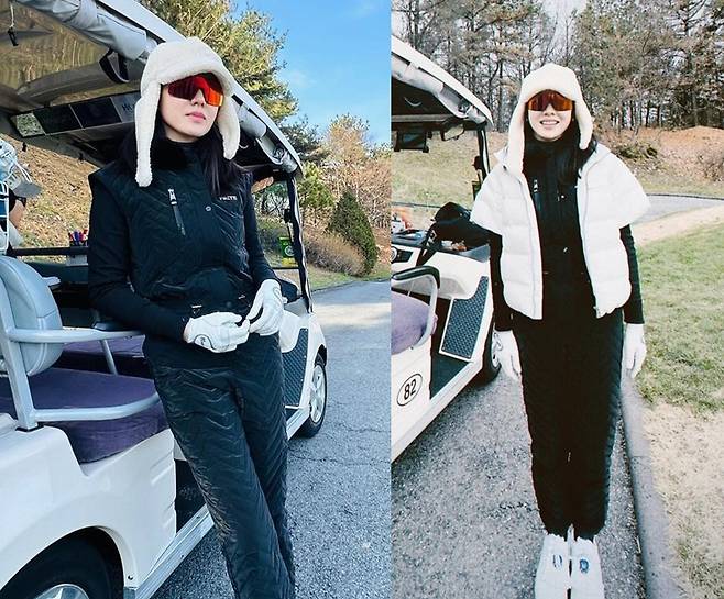 손예진은 블랙 패딩 점프 수트에 화이트 패딩 조끼, 털모자로 맹추위에 대비한 라운딩룩을 연출했습니다. 특히 손예진은 미러 고글까지 착용하고 차렷 자세로 환하게 웃는 사랑스런 모습은 보는 이로 하여금 절로 미소 짓게 했습니다.